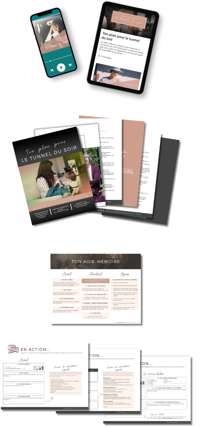 → Trois leçons audio avec une psychologue (Avant · Pendant · Après) Un plan étape par étape pour les trois moments critiques de ta soirée. Conçu par une psychologue spécialisée en enfance et familles, pas une influenceuse, pas une coach. Tu écoutes dans l’auto ou en faisant le souper, tu appliques ce soir.
